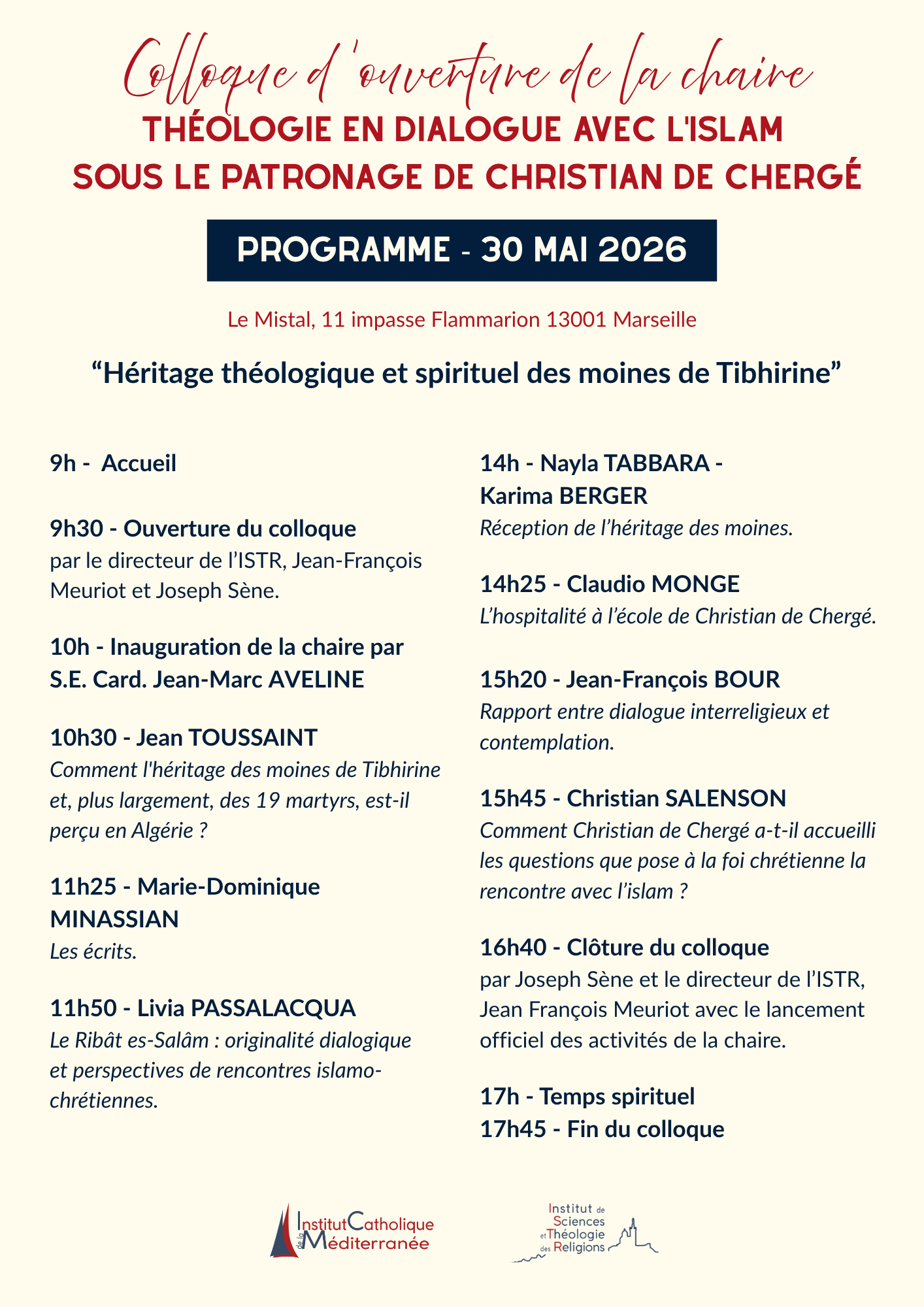 191282 30mai9h0018h00Inauguration chaire Christian de Chergé Détails de l'événement Détails de l'événement Horaire30 mai 2026 9h00 - 18h00 Ajouter à mon calendrier