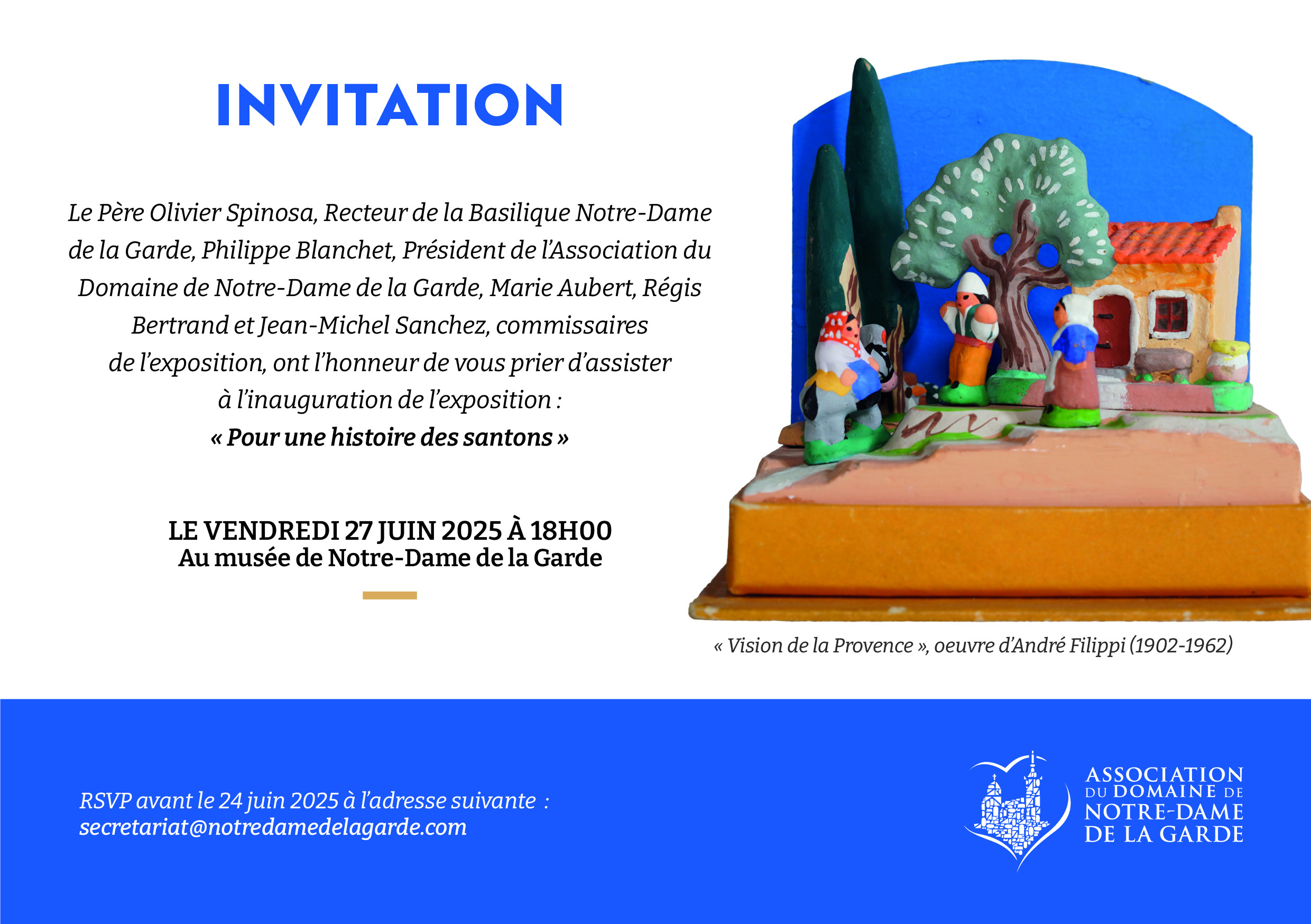 171951 27juin18h0019h30Inauguration de l'exposition "pour une histoire de santons" à Notre-Dame-de-la-Garde Détails de l'événement Détails de l'événement Horaire27 juin 2025 18h00 - 19h30 LieuBasilique de Notre Dame de la GardeOther Events Ajouter à mon calendrier