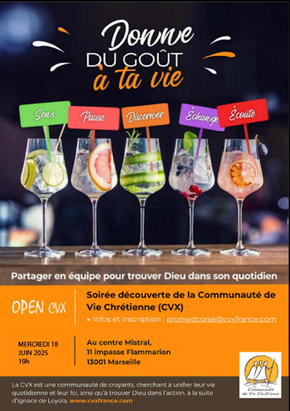 Soirée découverte de la CVX à Marseille le mercredi 18 juin au Mistral de 19 à 21 h. Pour plus d’infos : https://www.cvxfrance.com/open-cvx/soiree-open-cvx-a-marseille-13/