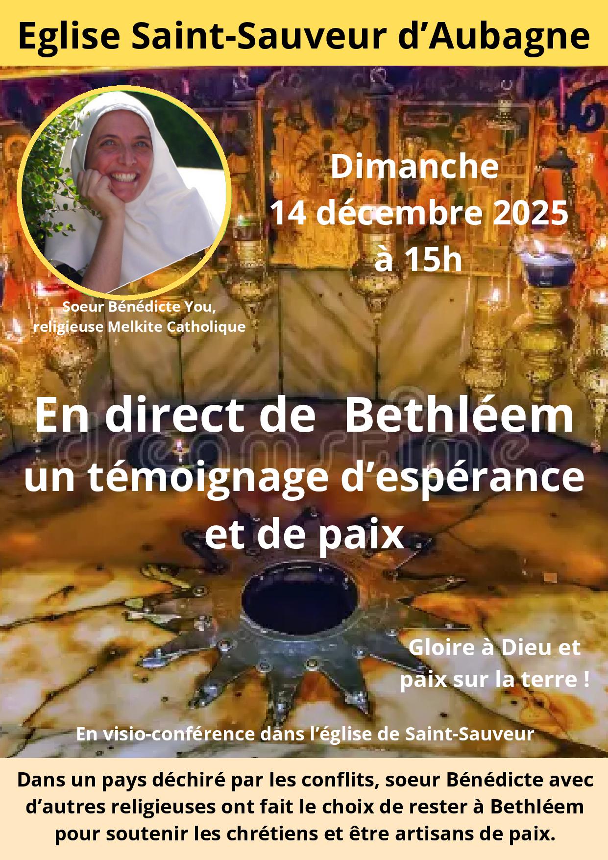 185682 14déc15h0017h00Témoignage en direct de Bethléem Détails de l'événement Détails de l'événement Horaire14 décembre 2025 15h00 - 17h00 Ajouter à mon calendrier