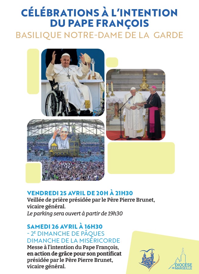 170014 25avr20h0021h30Veillée de prière à l'intention du pape François Détails de l'événement Détails de l'événement Horaire25 avril 2025 20h00 - 21h30 LieuBasilique Notre-Dame de la GardeOther Events Ajouter à mon calendrier