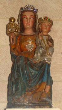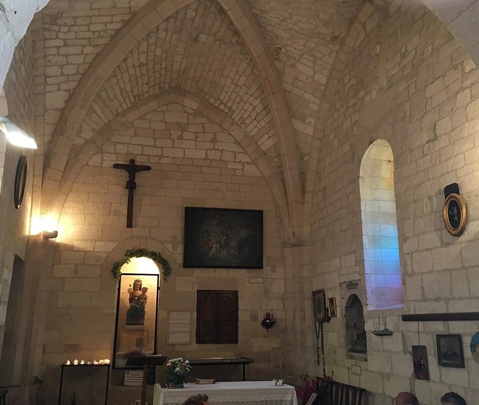 A l’intérieur, dans la niche centrale, se trouve la statue vénérée lors des pèlerinages, en bois de noyer polychromé, datant du XVe siècle (notre photo). Marie est assise, portant l’Enfant Jésus qui tient dans sa main gauche une petite poule (galino en provençal) blanche, d’où le nom donnée à la statue : Notre-Dame de la Galline. La poule est ici symbole de protection, abritant et rappelant ses poussins, c’est-à-dire les enfants de Dieu que nous sommes devenus par le baptême.